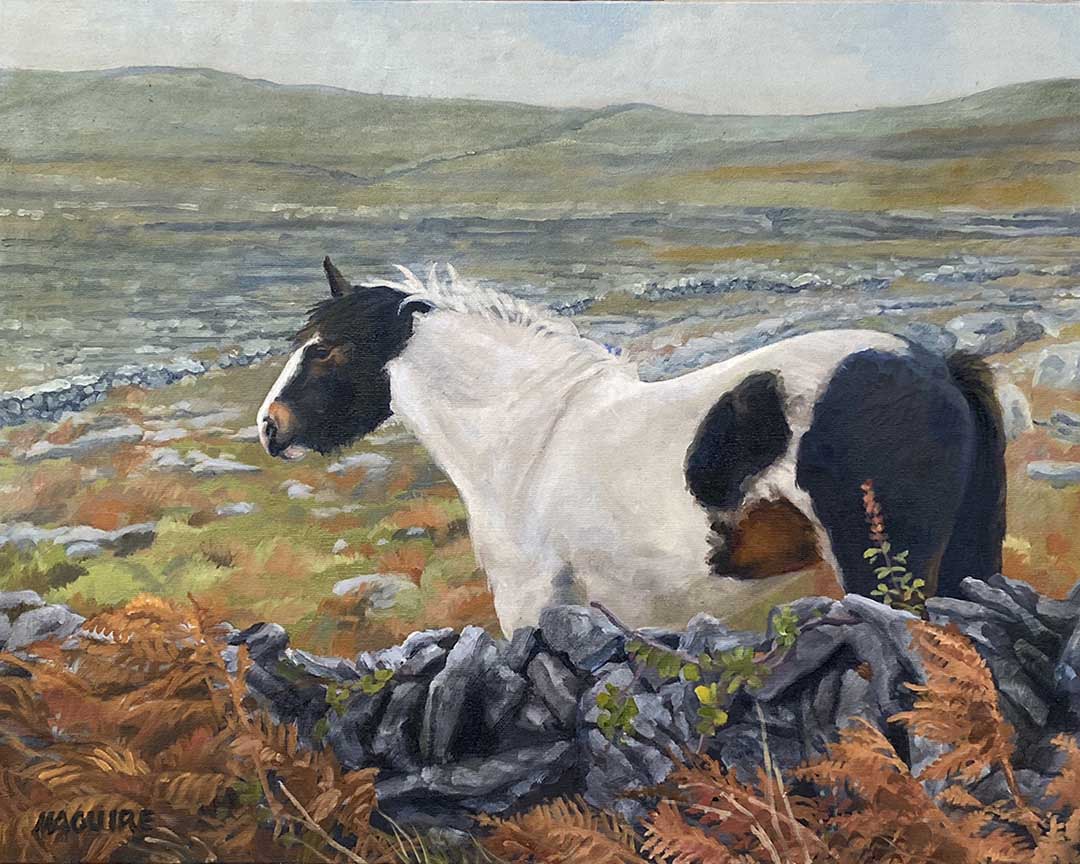 | In November when the ferns (and Ireland) have turned rust colored, we were driving slowly along the coast road from Ballyvaughn to Fanore, just past the point where the road turns sharply south and the rocky landscape begins to stretch out to the right from the road to the Atlantic when I met this beautiful pony with her handsone black head and large black markings (and one red-brown!) standing right up by the stone wall. Too good to pass up! |